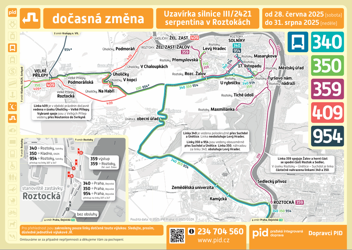 Od 28. června do 31. srpna 2025 dojde z důvodu stavebních prací k dočasným změnám v provozu autobusových linek 340, 350, 359 a 409. Linka 340 bude jezdit polokruhovou trasou přes Suchdol a Únětice a nebude obsluhovat Levý Hradec. Dojde k přesunům a zřízení nových zastávek, například Kamýcká (směr Roztoky), Únětice, Obecní úřad a Roztoky, Masarykova, zatímco zastávky Praha, Sedlecký přívoz a Roztoky, nádraží budou zrušeny. Linky 350 a 954 pojedou v obou směrech přes Suchdol a Únětice, přičemž linka 350 navíc zajistí náhradní obsluhu Levého Hradce. I zde budou zrušeny zastávky Praha, Sedlecký přívoz a Roztoky, nádraží. Linka 359 bude nově propojovat Žalov s horní a dolní částí Roztok a Sedlcem, přičemž úsek mezi Roztoky, Úněticemi a Suchdolem bude zajištěn linkami 340 a 350. Linka 409 bude během prázdnin dočasně jezdit mezi Úholičkami a Velkými Přílepy.