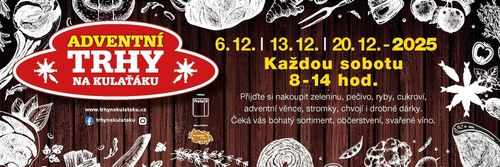 Adventní trhy na Kulaťáku: budou otevřeny všechny adventní soboty 29. 11., 6., 13., 20. 12. od 8 do 14 hodin a k předvánoční atmosféře nabídnou typický sortiment – vánoční ozdoby a dekorace, svařené víno, horké mošty, čerstvé ryby, cukroví, jmelí, chvojí a adventní věnce.