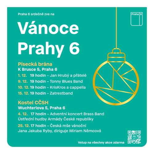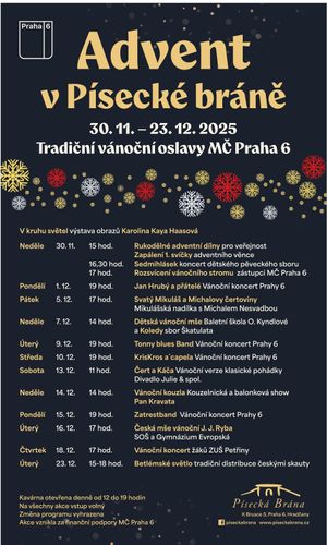 Vánoční čas v Praze 6 je tradičně plný sváteční atmosféry, kulturních akcí a příležitostí k setkávání. Po loňské výborné zkušenosti připravila městská část pro své obyvatele i návštěvníky koncertní program v Písecké bráně, který bude zahájen první adventní sobotu rukodělnými dílnami pro veřejnost a zapálením 1. svíčky adventního věnce. Kompletní program s koncerty najdete ZDE