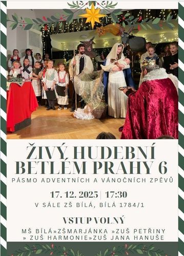 Živý Betlém: unikátní pásmo vánočních zpěvů a koled v podání dětí z šestkových uměleckých škol se bude konat 17. 12. od 17:30 v sále ZŠ Bílá.