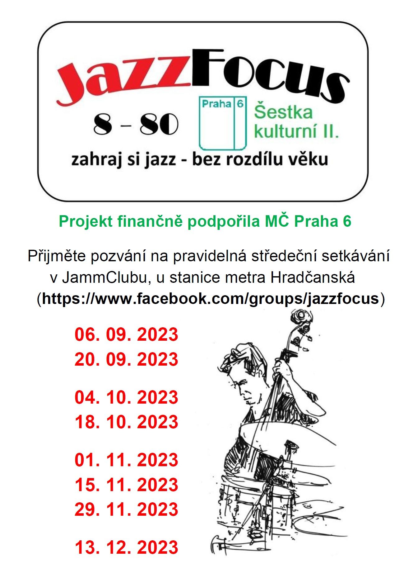 Přiměte pozvání na pravidelná středeční setkávání amatérských hudebníků v rámci nekomerčního projektu JazzFocus 8-80 (zahraj si Jazz bez rozdílu věku). Projekt finančně podpořila MČ Praha 6.