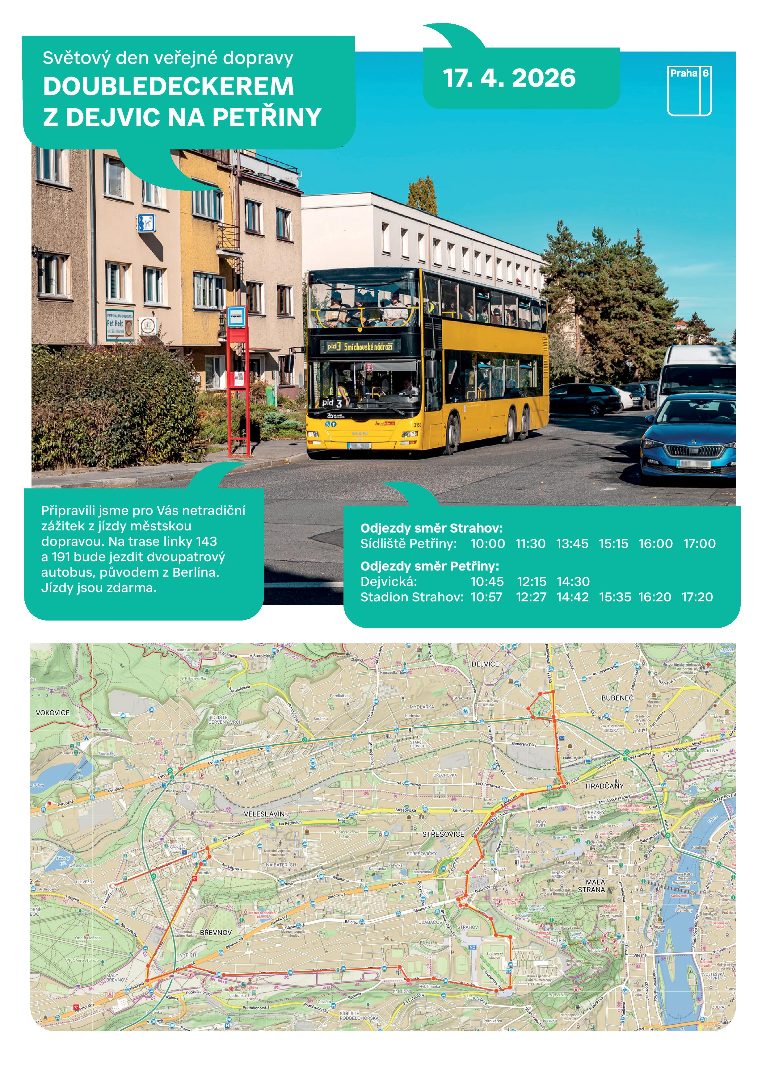 Městská část Praha 6 se letos připojuje k oslavám Světového dne veřejné dopravy pod záštitou Mezinárodní asociace veřejné dopravy (UITP). V pátek 17. dubna nabídne obyvatelům i návštěvníkům zážitkové jízdy ikonickým dvoupatrovým autobusem.