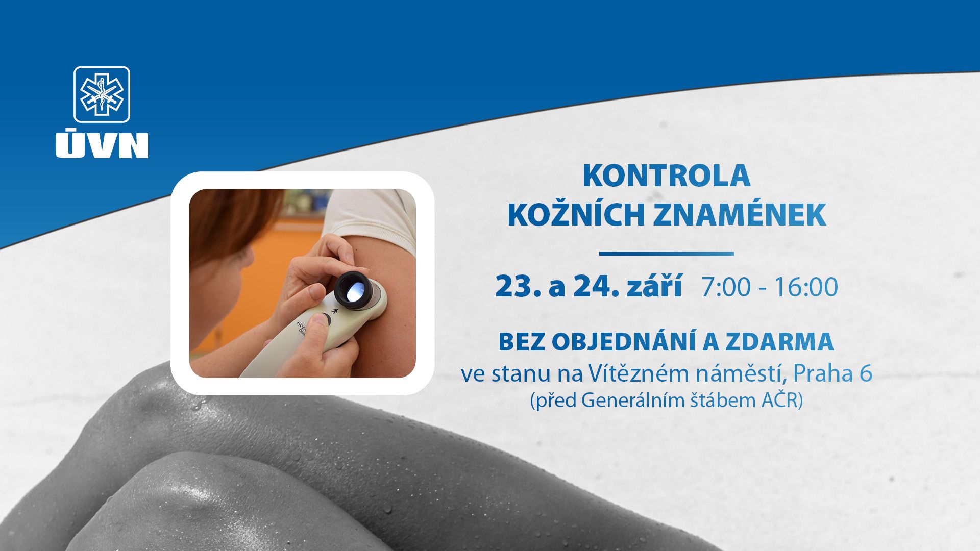 Ústřední vojenská nemocnice (ÚVN) připravila preventivní akci, kde budou moci zájemci nechat svá kožní znaménka zdarma zkontrolovat. Na Vítězném náměstí v Praze 6 před budovou Generálního štábu AČR bude od 7:00 do 16:00 připravený stan ÚVN, kde budou k dispozici dva lékaři a jedna zdravotní sestra. Kontrola je zdarma a není potřeba se na ni dopředu objednávat.