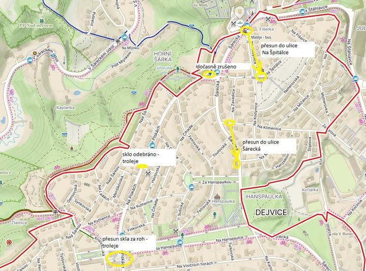 • stanoviště u autobusové zastávky v ulici Šárecká (naproti Albertu) je přesunuto směrem do ulice Na Špitálce