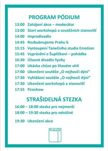 Prožijte dobrodružné a strašidelné odpoledne nejen pro nebojácné děti. Můžete se těšit na Strašidelnou stezku, tematickou dobrodružnou stezku plnou úkolů, workshopy se zaměřením na rukodělné aktivity, doprovodný program na pódiu a Fireshow. Budete mít možnost si na místě vydlabat svoji dýni a zúčastnit se soutěže o nejhezčí dýni. Samozřejmostí je i občerstvení a posezení. Každé dítě, které splní úkoly na hlavní cestě od Vypichu k letohrádku Hvězda dostane odměnu a pamětní list od vlkodlaka. Hlavní program začíná ve 13 hodin. Vezměte své děti a přijďte s námi strávit příjemné a zábavné odpoledne i podvečer v oboře Hvězda.
