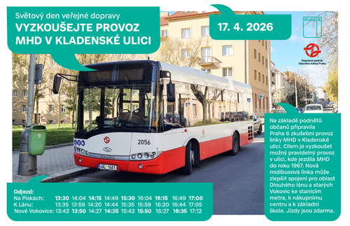 Městská část Praha 6 se letos připojuje k oslavám Světového dne veřejné dopravy pod záštitou Mezinárodní asociace veřejné dopravy (UITP). V pátek 17. dubna nabídne obyvatelům i návštěvníkům zážitkové jízdy ikonickým dvoupatrovým autobusem a otestuje nové spojení v ulici Kladenská.