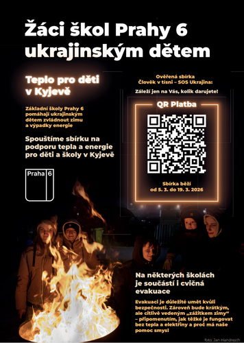 Cílem této iniciativy žáků škol Prahy 6 je podpořit teplo a energii pro děti a školy přímo v Kyjevě. Finanční podporu lze realizovat skrze prověřenou sbírku Člověk v tísni – SOS Ukrajina, přičemž dárci mohou využít i jednoduchou QR platbu a sami se rozhodnout, kolik darují.